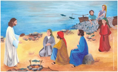 So lautet das Leitwort für die kommende Erstkommunion. Es greift die Einladung Jesu an die Jünger am Ufer des Sees von Tiberias auf, von der im Johannesevangelium (Kapitel 21, Verse 1–14) berichtet wird.